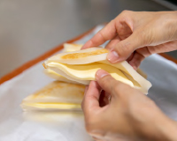 角焼または白焼を斜め半分にカットして三角形にしたら、包丁を差し込んで切れ目を入れ、袋状にします。